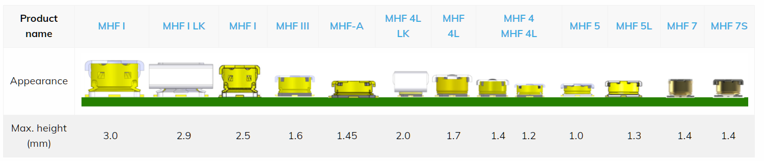 IPEX haben unterschiedliche Serien MHF I, MHF 1 LK, MHF II, MHF III, MHF-A, MHF 4L LK, MHF 5, MHF 5L, MHF 7, MHF 7s von Multi Height.
